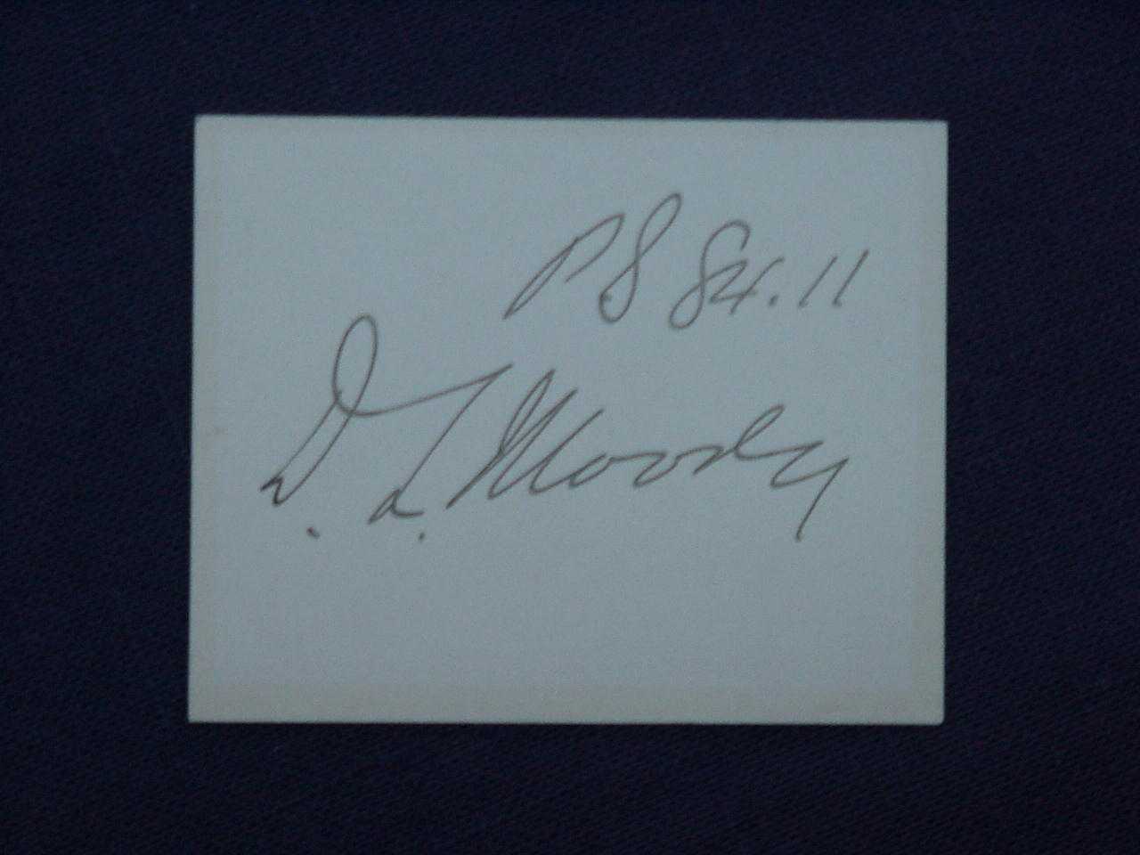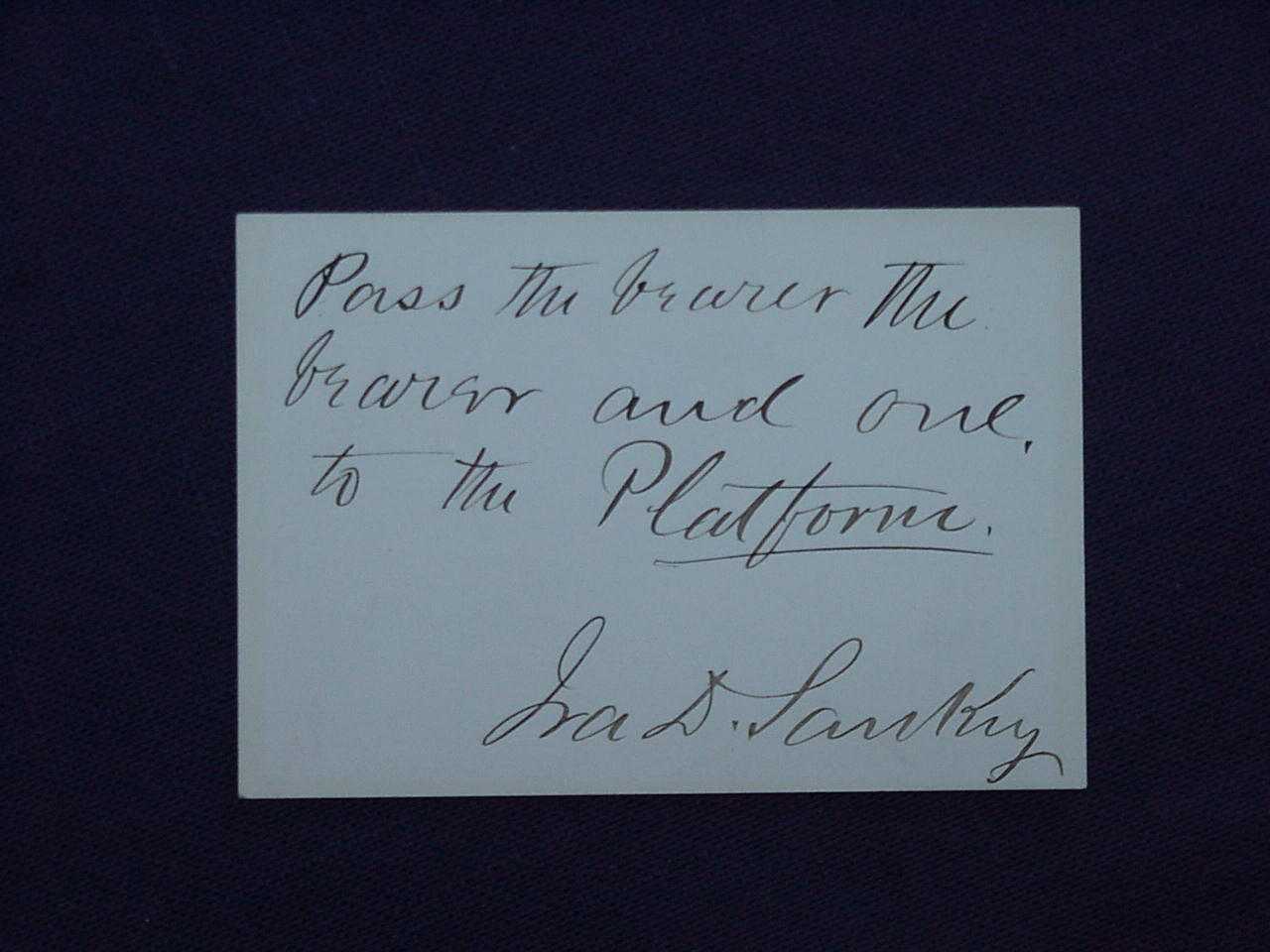[Moody & Sankey] Dwight Lyman Moody: "PS 84.11 D.L.Moody", a scripture verse with Moody's signature on a card measuring 3 1/4" x 2 9/16", verso blank. AND Ira D. Sankey: "Pass the bearer the bearer and one, to the Platform. Ira D. Sankey" Autograph note, signed, on a card measuring 4 1/8" x 2 11/16" [the card is the card of "Mrs. Francis White" and reads at the bottom "Monday, January seventh. from four until seven o'clock. 1114 St. Paul Street". The pair, $500.
