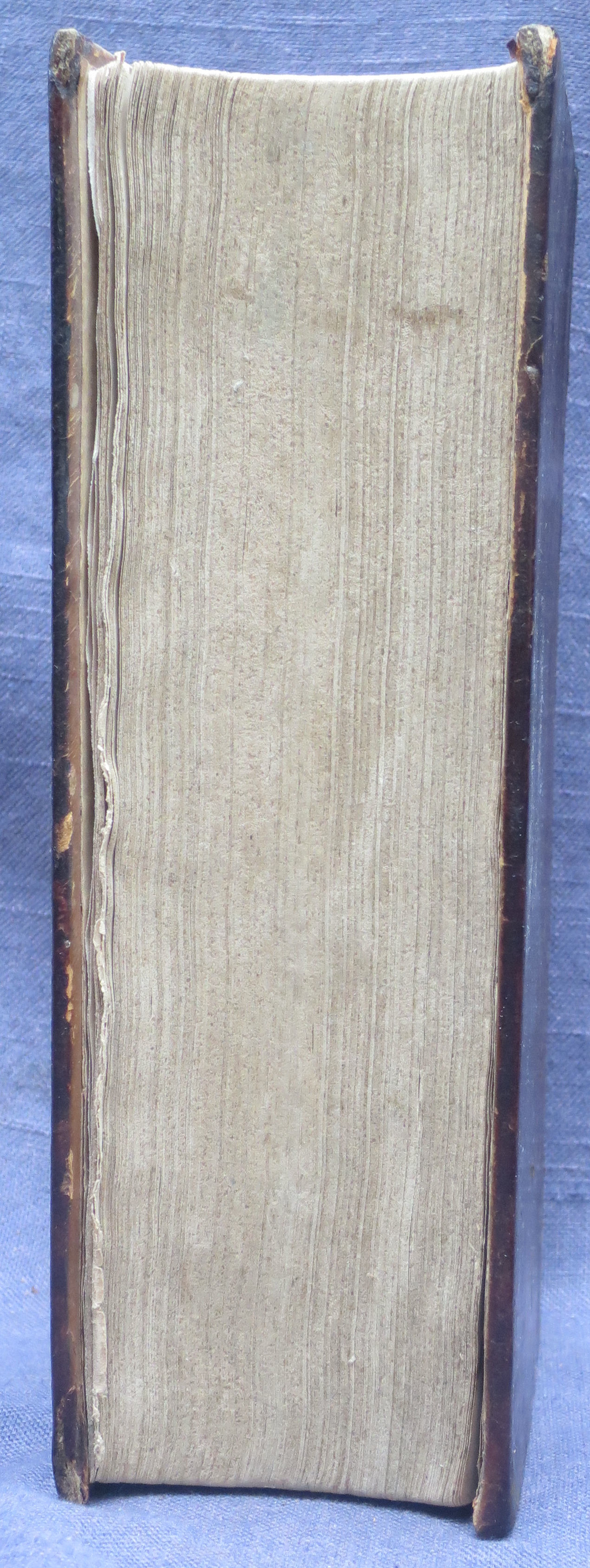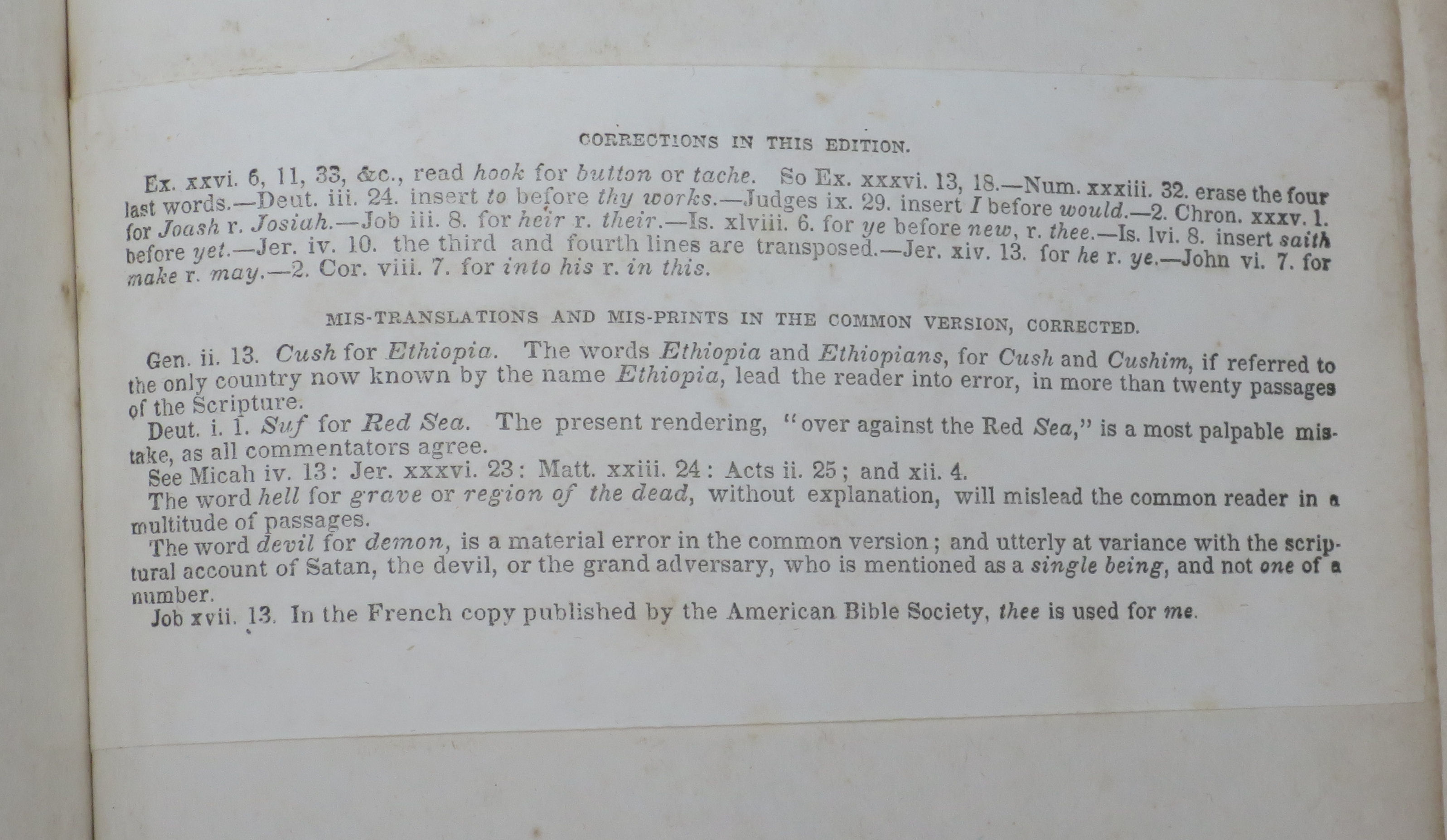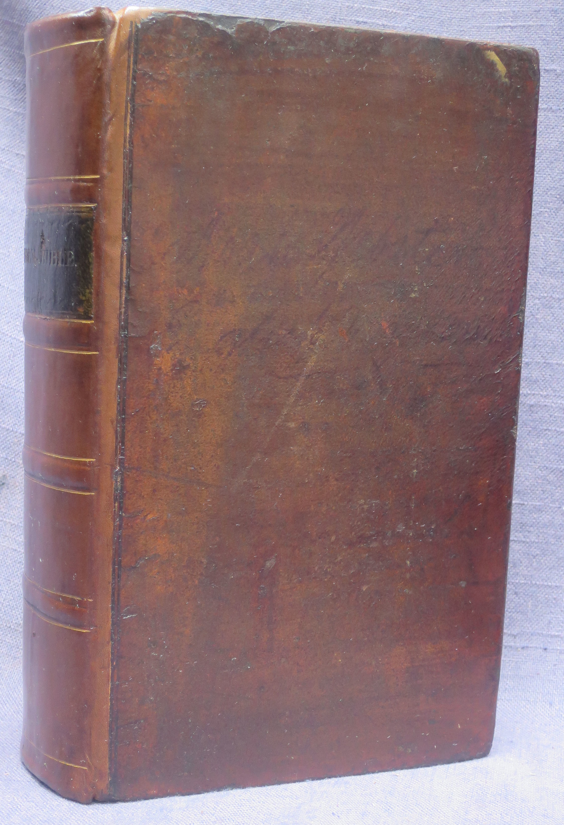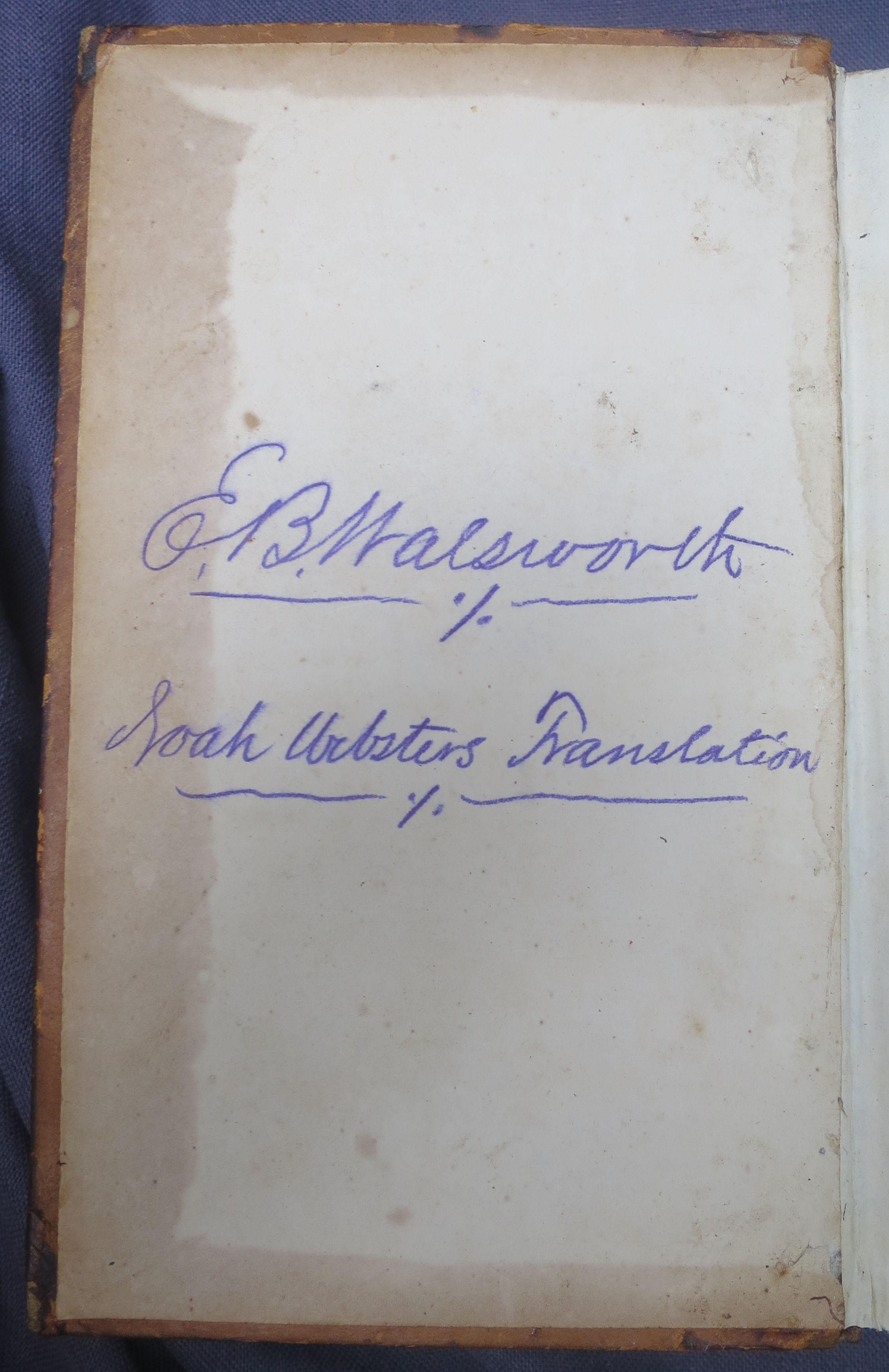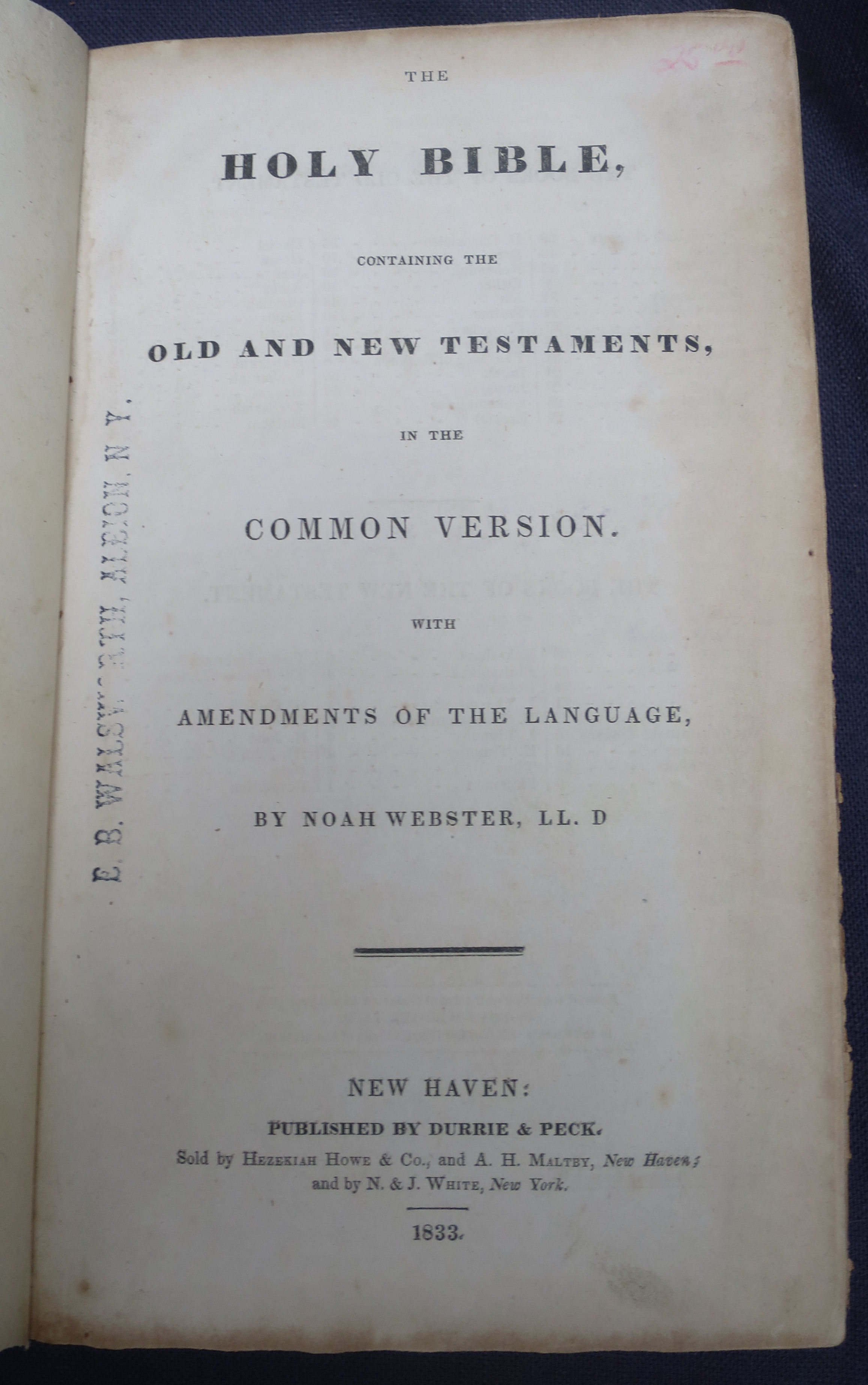 The Holy Bible, ...in the Common Version. with Amendments of the Language. By Noah Webster, LL.D. New Haven: Durrie & Peck, 1833. Original calf, newly rebacked reusing the original label; new free front endpaper (on compatible paper); the second and third leaves of gathering '1' (the second and third leaves of Genesis) are slightly pulled, with minor fraying to their outer edges, but otherwise the text is in very good condition throughout. There is an errata slip tipped in, facing the blank verso of the last leaf of Revelation. ***Herbert 1793; Hills 826; with an ownership inscription of an early (perhaps the first) owner inside the front cover and his name stamp to the inner margin of the title; a nice copy of the FIRST edition, quite scarce and much sought after. $8000.